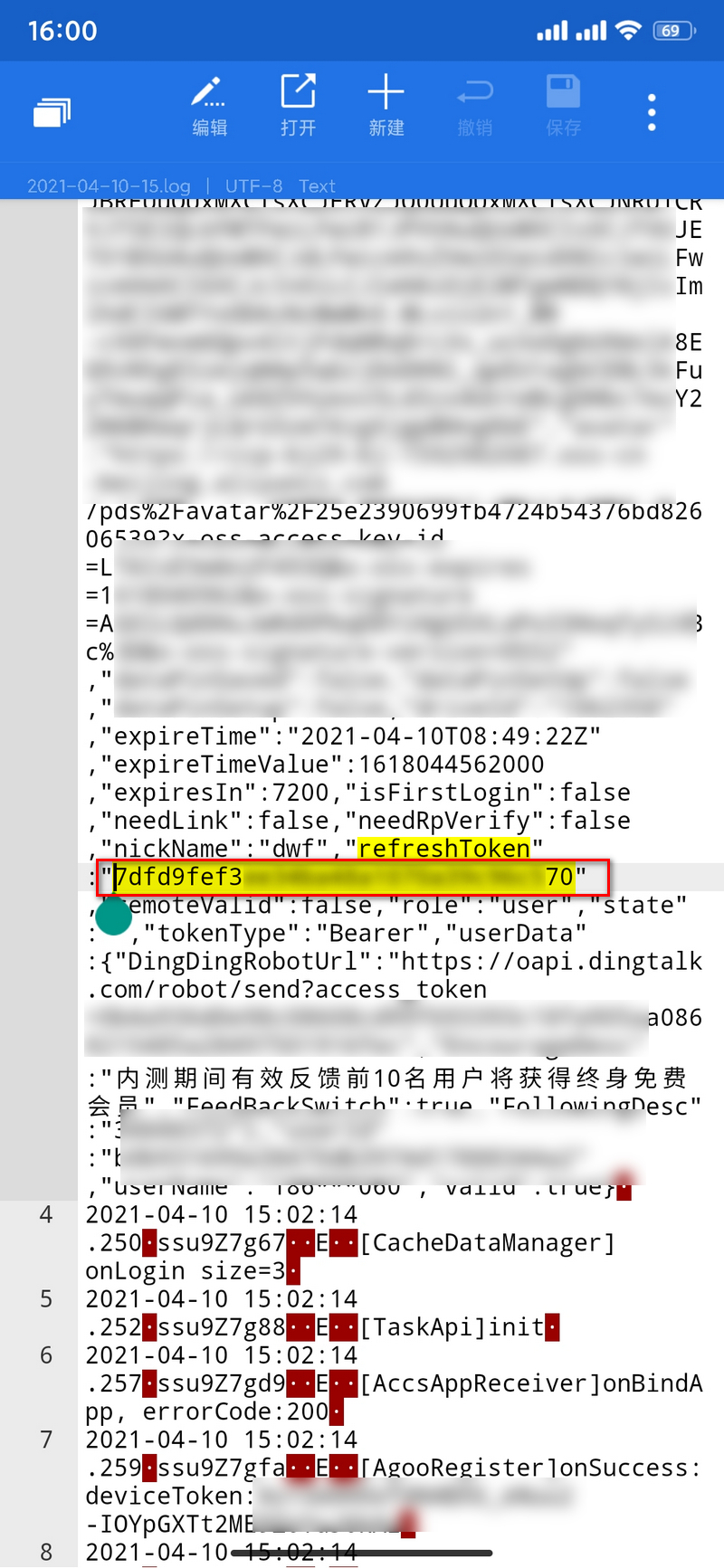 打开日志后下拉找到refreshToken,后面的那一串字符就是新的Token了,如我的是7dfd9fef3....70