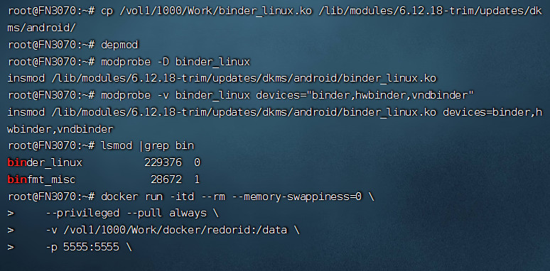 cp /vol1/1000/Work/binder_linux.ko /lib/modules/6.12.18-trim/updates/dkms/android/ depmod modprobe -D binder_linux
