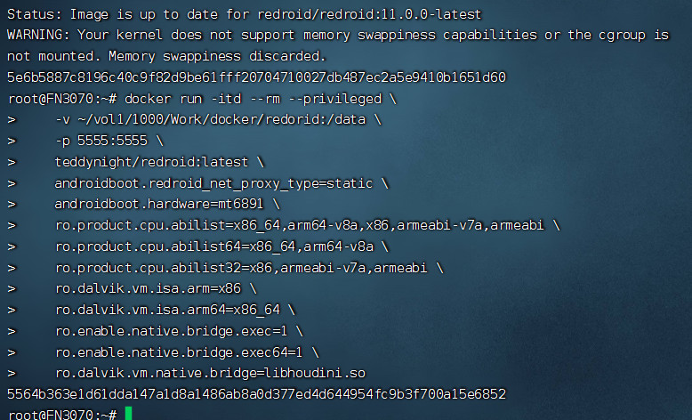 docker run -itd --rm --privileged \ -v /vol1/1000/Work/docker/redorid:/data \ -p 5555:5555 \ teddynight/redroid:latest \ androidboot.redroid_net_proxy_type=static \ androidboot.hardware=mt6891 \ ro.product.cpu.abilist=x86_64,arm64-v8a,x86,armeabi-v7a,armeabi \ ro.product.cpu.abilist64=x86_64,arm64-v8a \ ro.product.cpu.abilist32=x86,armeabi-v7a,armeabi \ ro.dalvik.vm.isa.arm=x86 \ ro.dalvik.vm.isa.arm64=x86_64 \ ro.enable.native.bridge.exec=1 \ ro.enable.native.bridge.exec64=1 \ ro.dalvik.vm.native.bridge=libhoudini.so
