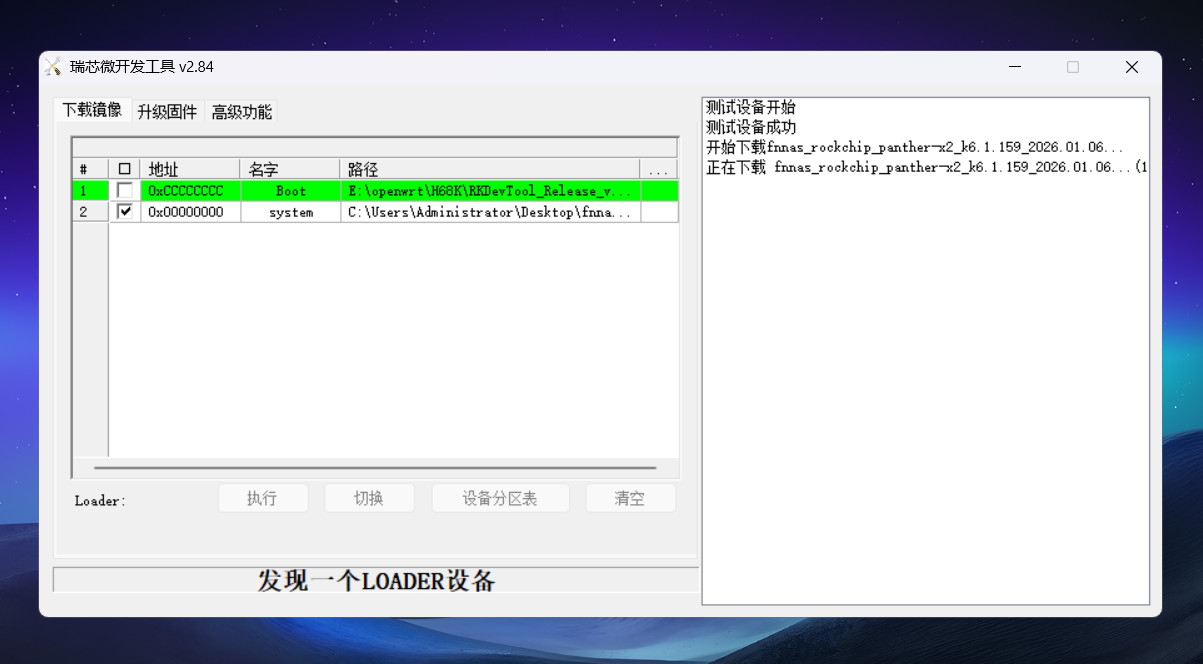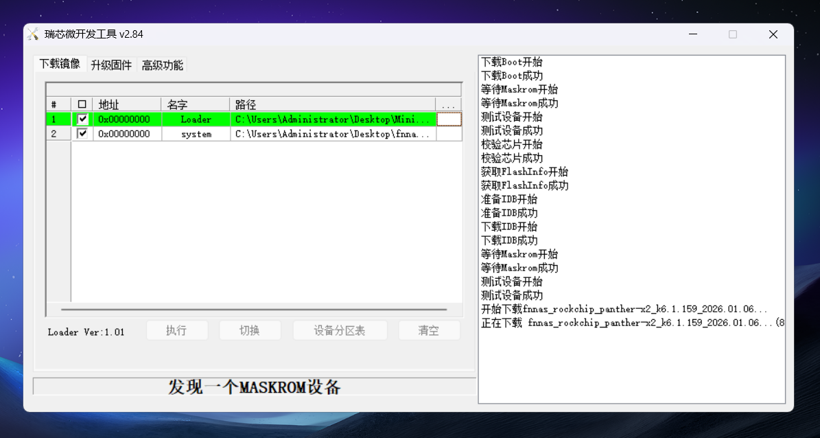 如果是之前未刷过机,或者机器自动进入了MASKROM设备,需要添加一个Loader再刷入MiniLoaderAll.bin system选择固件,即可。
