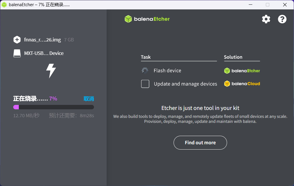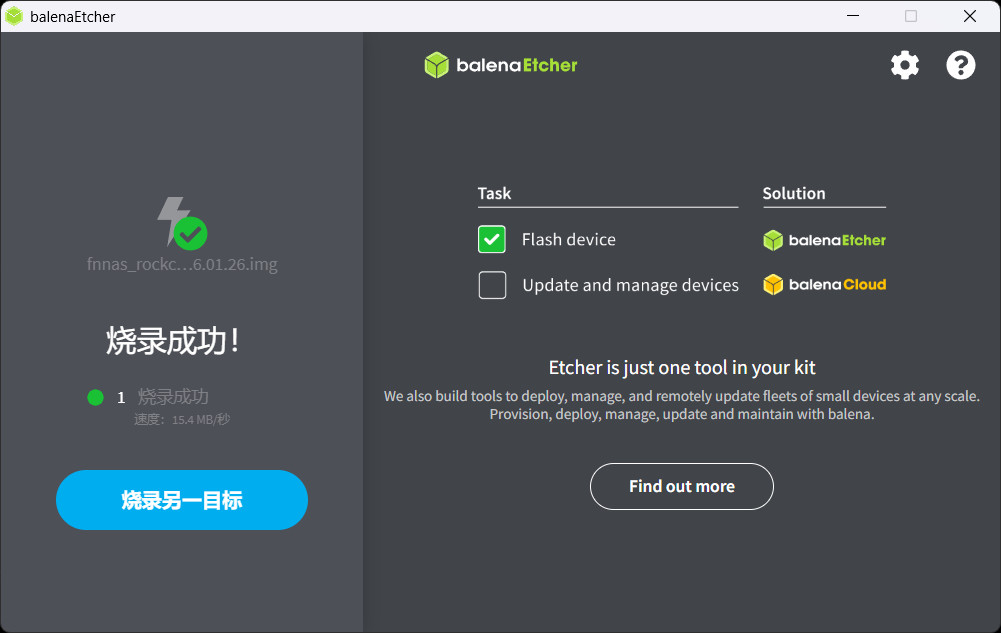 下载一个balenaEtcher写盘工具,打开工具选择fnnas_rockchip_smart-am40_k6.12.41_2026.01.26.img,选择TF卡写入