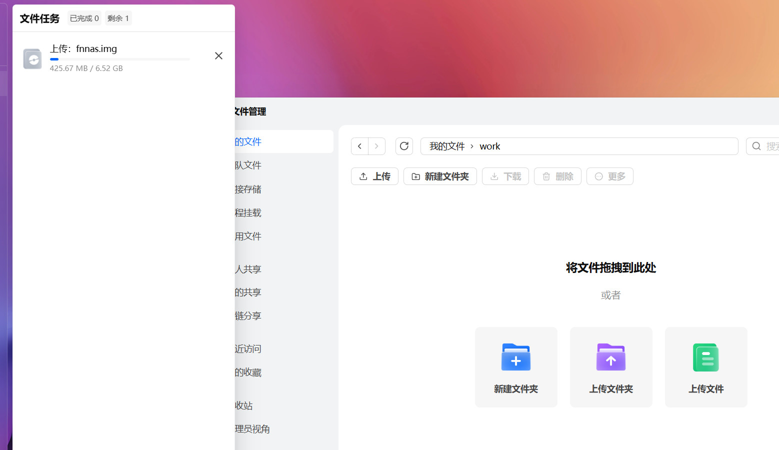 打开文件,随便新建个文件夹 把fnnas_rockchip_smart-am40_k6.12.41_2026.01.26.img重命名fnnas.img,上传到文件夹