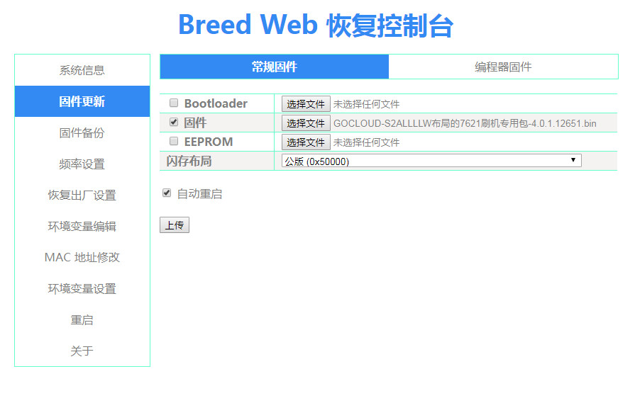 首先如图选择GOCLOUD-S2ALLLLW布局的7621刷机专用包-4.0.1.12651.bin先刷入底包